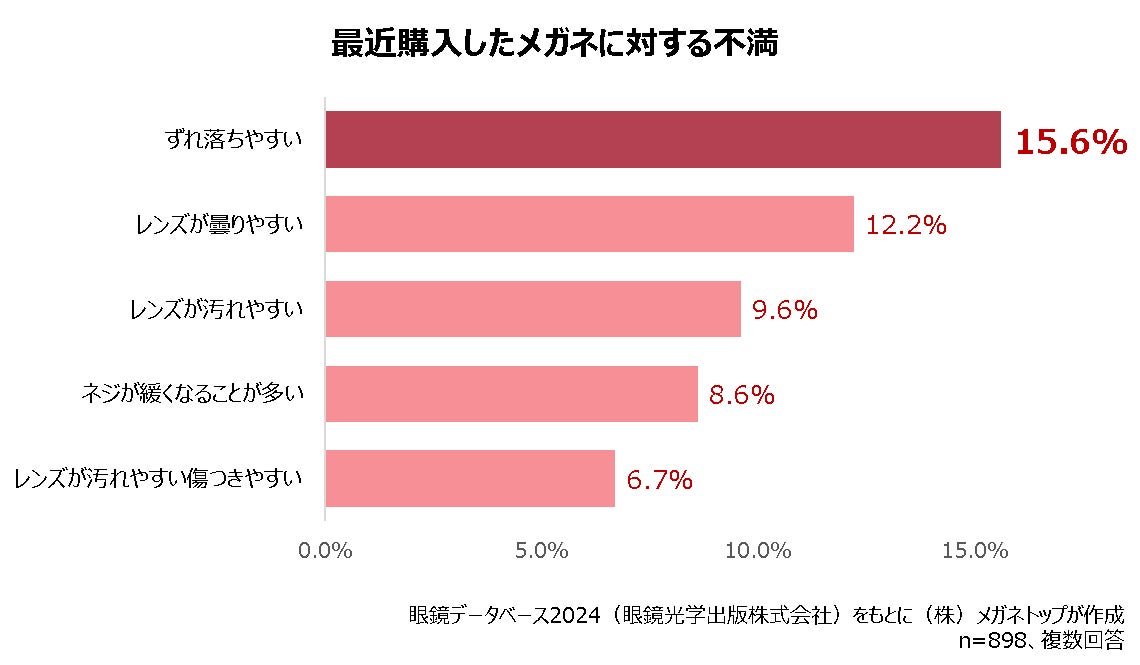 眼鏡データベース2024(眼鏡光学出版株式会社)が「最近購入したメガネに対する不満」(n=898)について調査した結果、15.6%の方が「メガネのずれ落ち」と回答しました。