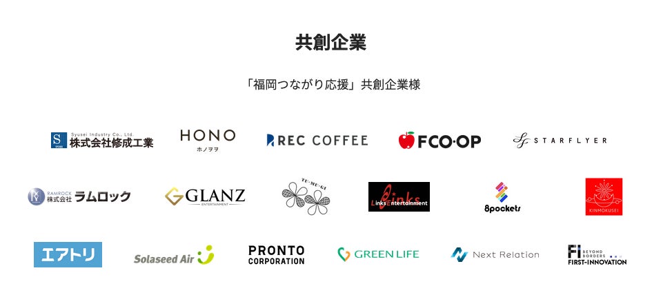 企業統括である株式会社修成工業をはじめ、HONO株式会社、レックコレクティブ株式会社、エフコープ生活協同組合、株式会社スターフライヤー、株式会社ラムロック、Glanz株式会社など、福岡県で活動される企業様、約11社様と、その他、連携企業として株式会社エアトリ、株式会社ソラシドエア、株式会社プロントコーポレーション、グリーンライフ株式会社などの企業様とともにキャンペーンを展開します。