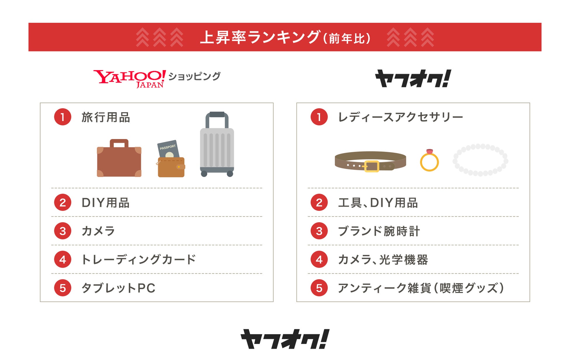 「Yahoo!ショッピング」「ヤフオク!」のカテゴリ上昇率ランキングは以下のとおりです。