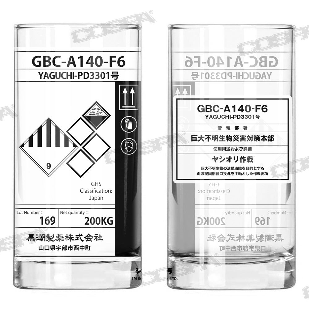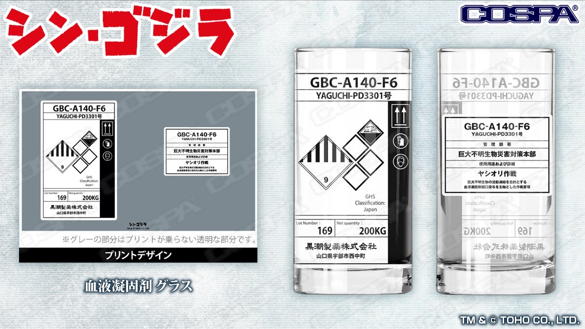 『シン・ゴジラ』作中にヤシオリ作戦に使用された「血液凝固剤」の容器ラベルをイメージしたグラスもラインアップ。