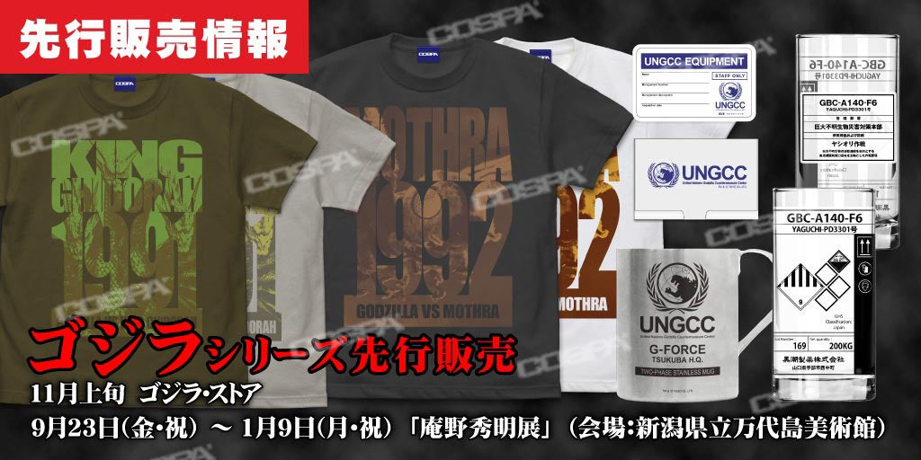 『ゴジラ』より「モスラ」「キングギドラ」のTシャツ、「Gフォース」ステッカーやファティーグジャケット、「第一機龍隊」刺繍キャップ。『シン・ゴジラ』より「血液凝固剤」グラスなど新登場!【株式会社コスパ】
