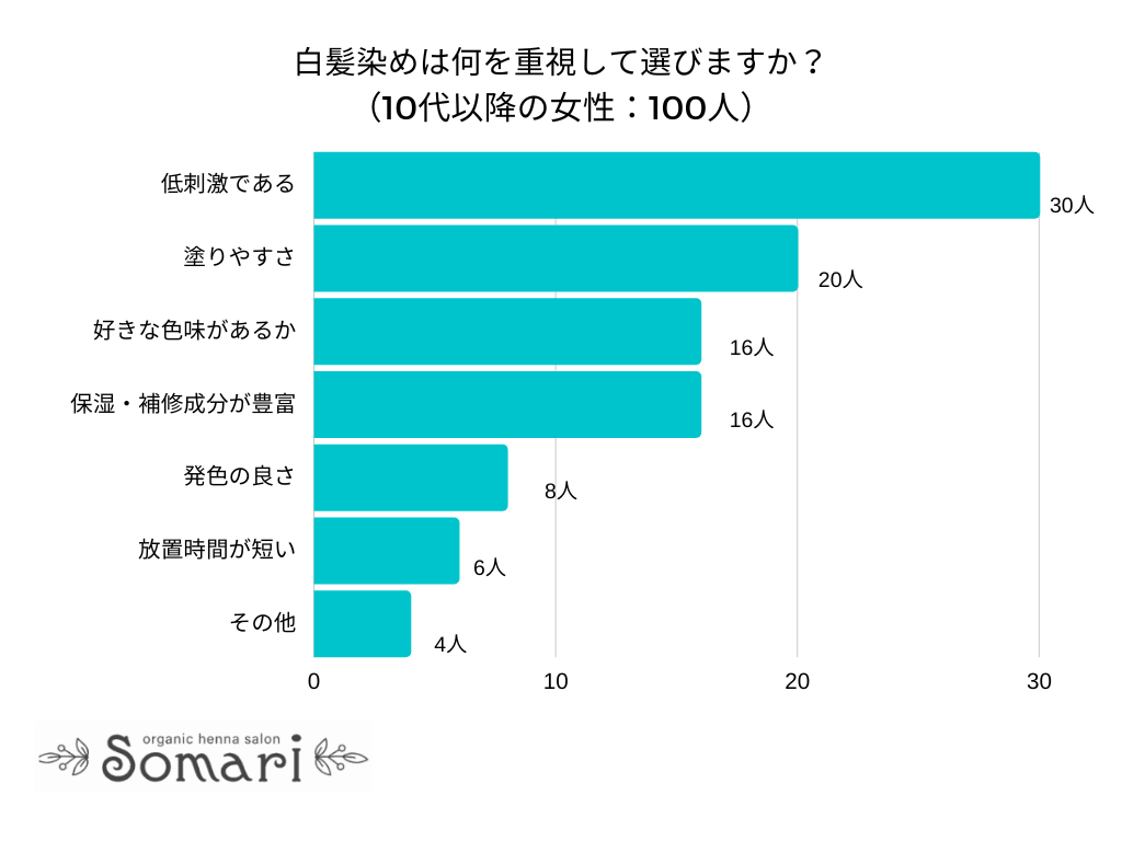 「白髪染めは何を重視して選びますか?」とアンケート調査した結果、1位は『低刺激である』でした。