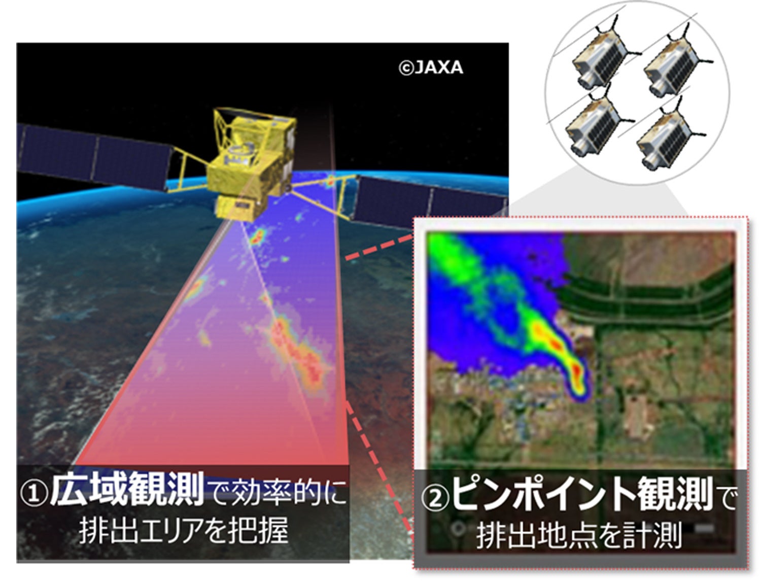 今回、4社は温室効果ガスの削減に取り組むユーザーを対象に、衛星データを利用した温室効果ガスの排出量をわかりやすく可視化するサービスの検討を進めます。具体的には、温室効果ガス観測技術衛星「いぶき」(GOSAT)(※1)シリーズ衛星の広域にわたる観測データと、GHGSat社が持つ衛星コンステレーション(※2)による温室効果ガスの発生源のピンポイント観測データを融合し、温室効果ガスの排出量をわかりやすく可視化したデータを提供するサービスについて検討します。継続的に温室効果ガスの排出量をモニタリングし、客観的で精度の高いデータを提供する他、エネルギーパイプラインのガス漏れなどの異常を迅速に通知し、事故を防ぐなど、安全管理にも寄与することを目指します。ユーザーは新規に設備を導入することなく、衛星データに基づく温室効果ガスの排出量を把握可能となります。また、温室効果ガス削減に向けた具体的な目標設定や効率的な進捗管理を行うことで、透明性・サステナビリティを高めることができます。