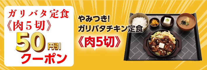 宮本むなし公式アプリでは、「やみつき!ガリバタチキン定食(肉5切)50円引き」クーポンを配信しております。
