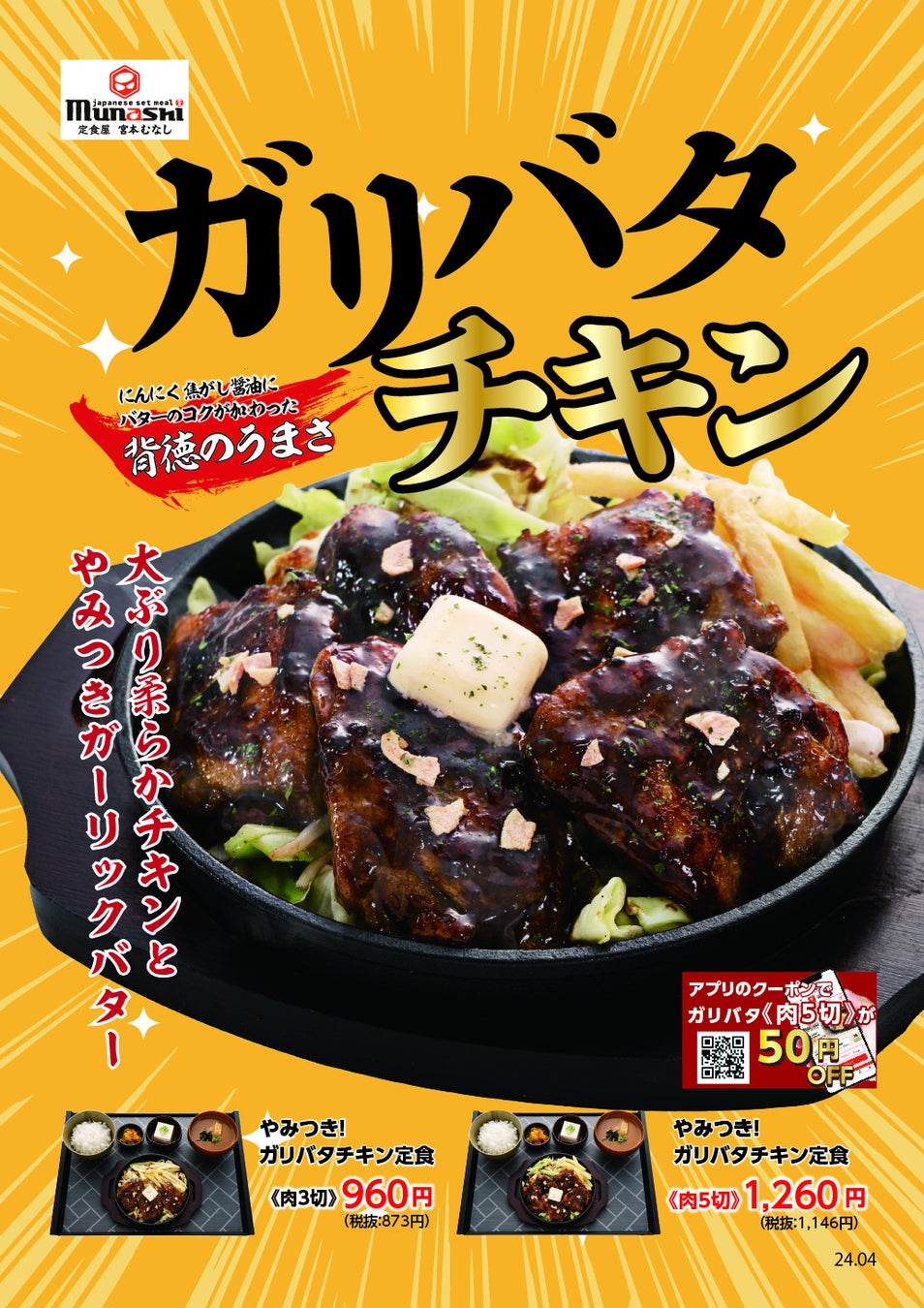【定食屋 宮本むなし】4/10~「やみつき!ガリバタチキン定食」を期間限定で販売開始