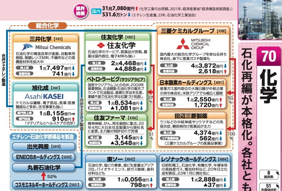 カテゴリーごとに色分けされた地図を見れば、業界がどのように分類されるか、各カテゴリーの主要企業はどこかが一目瞭然です。テキストで製品名や最近の状況が、業績と矢印マークで直近の売上高や利益の動きがひとめでわかります。