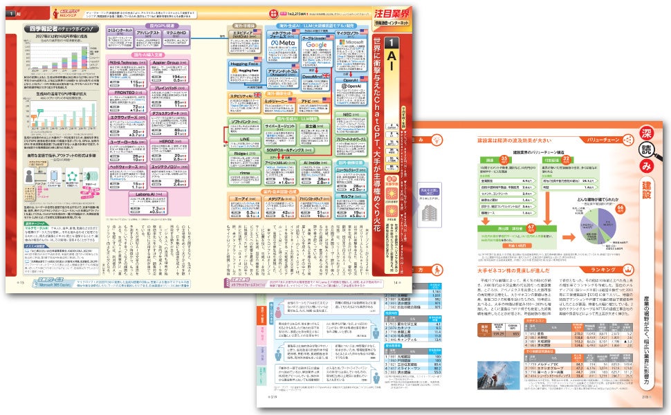 業界ごとに、主要な企業の順位・業績・提携関係などを「地図」にして、視覚的にわかりやすく解説したものです。企業をとりまく状況、業界の規模、今後予想される動きを知ることができます。さらに、「会社四季報 業界地図」では「会社四季報」の各業界担当記者が解説を付けています。確かな視点で業界の現状を分析します。