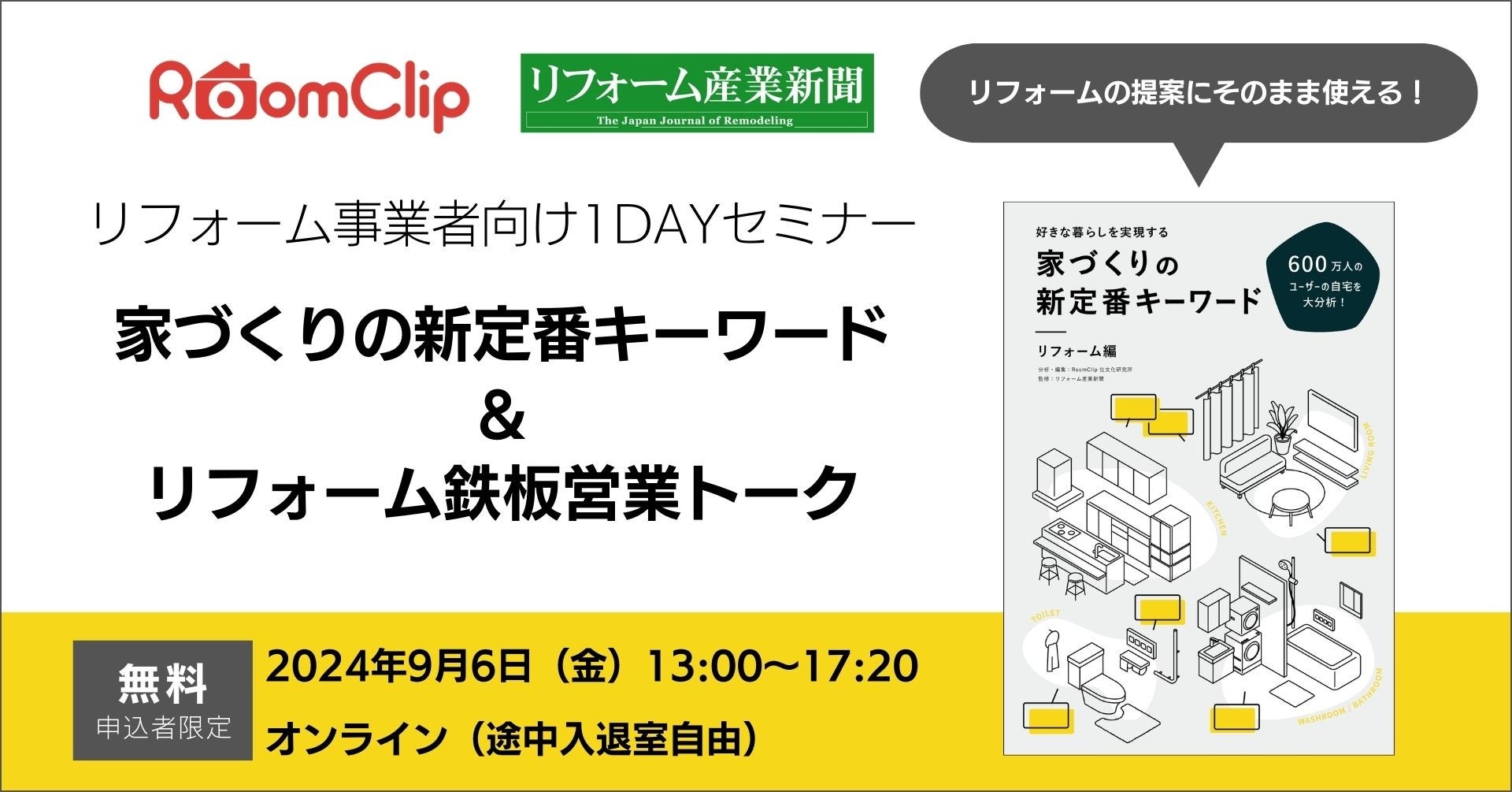 これに伴い、本冊子を活用したリフォーム事業者向けの1DAYセミナー「家づくり新定番キーワード&リフォーム鉄板営業トーク」を開催いたします。セミナーでは、キーワード解説のほか、リフォーム提案時の冊子の活用方法をご紹介いたします。