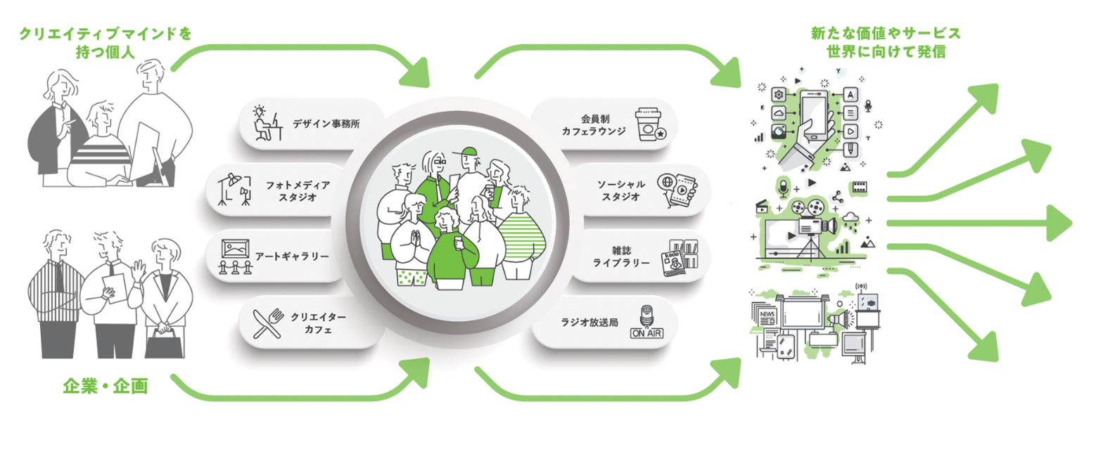 多様な人や企業との共創や、交流の仕組み・場づくりを通じて「創造」「発信」「集積」を循環させ、共感する人や企業とパートナーシップやアライアンスを構築していきます。