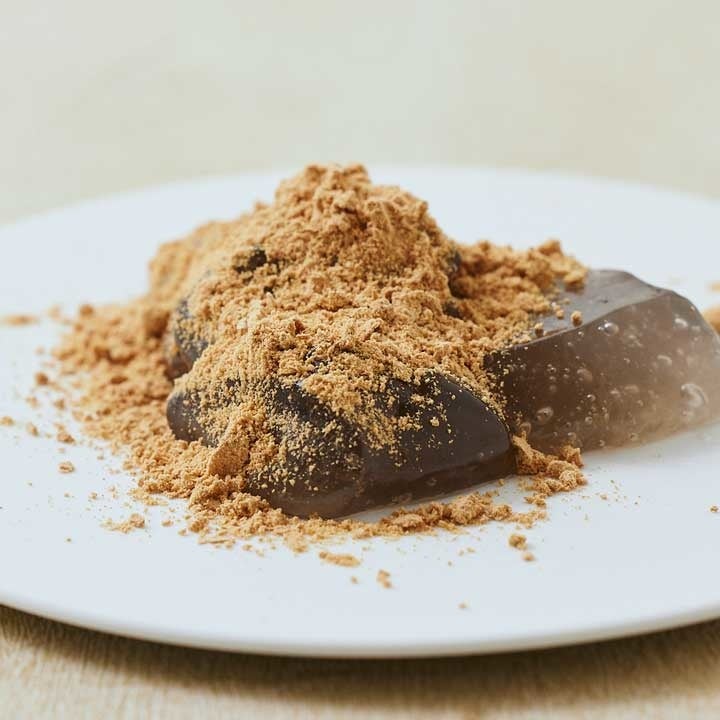 本わらび粉を使用した上品な弾力と口溶けなめらかなとろり食感にやさしい甘み。別添えきな粉や黒蜜につけてお召し上がりください。