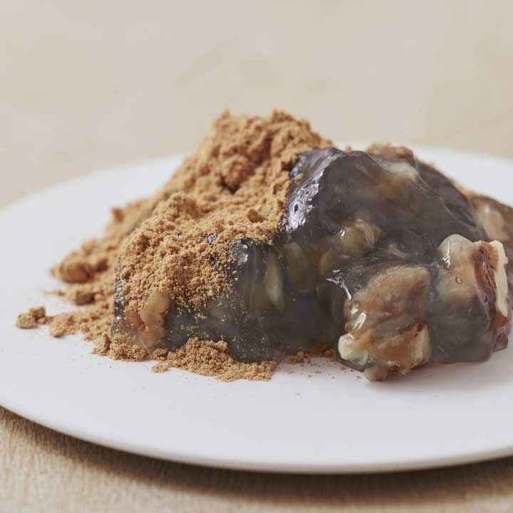 わらび餅のやさしい甘さと香ばしいくるみの香りと深い味わい。ごろごろ入ったくるみの食感がくせになる五感で楽しむわらび餅です。