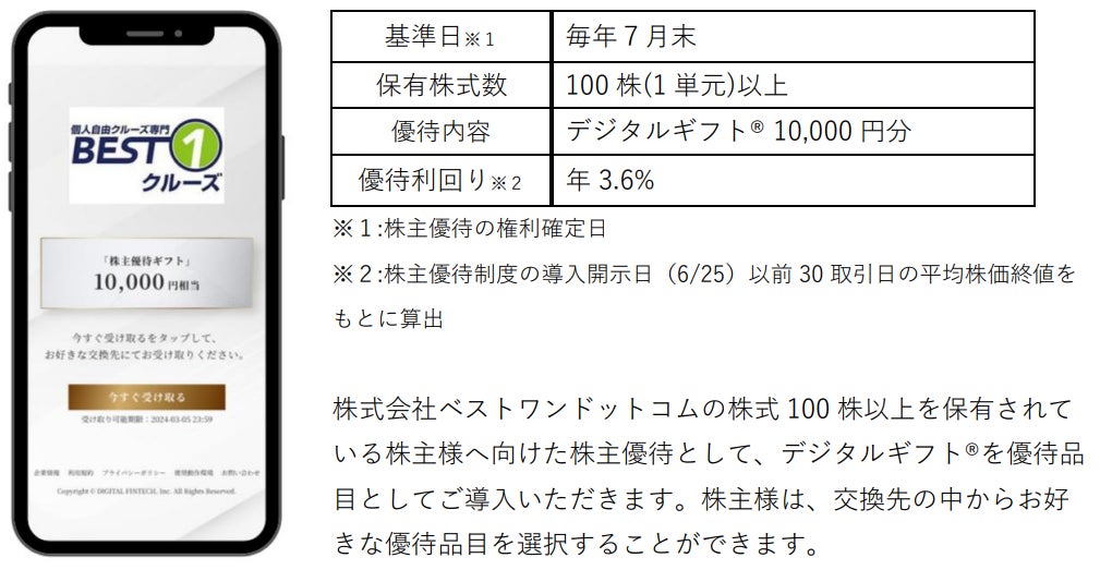 株式会社ベストワンドットコム(代表取締役会長:澤田 秀太、東証グロース市場:証券コード6577)において、株式会社デジタルプラス(代表取締役社長:菊池 誠晃、本社:東京都渋谷区、東証グロース市場:証券コード3691)の子会社である、株式会社デジタルフィンテック(代表取締役社長:菊池 誠晃、本社:北海道札幌市)が運営する「デジタルギフト®」を株主優待としてご活用いただくことになりました。