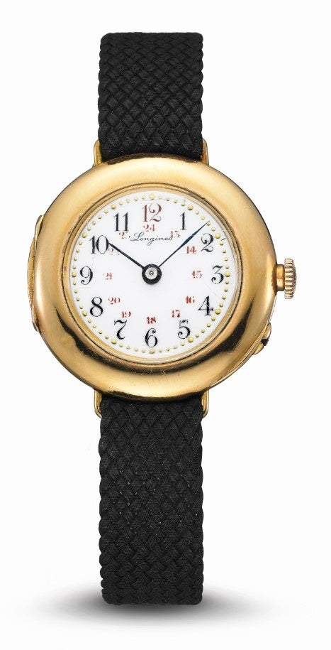 <右:通常ロンジン ミュージアム(サンティミエ)にて展示されるロンジンの現存最古の腕時計(1902年)>