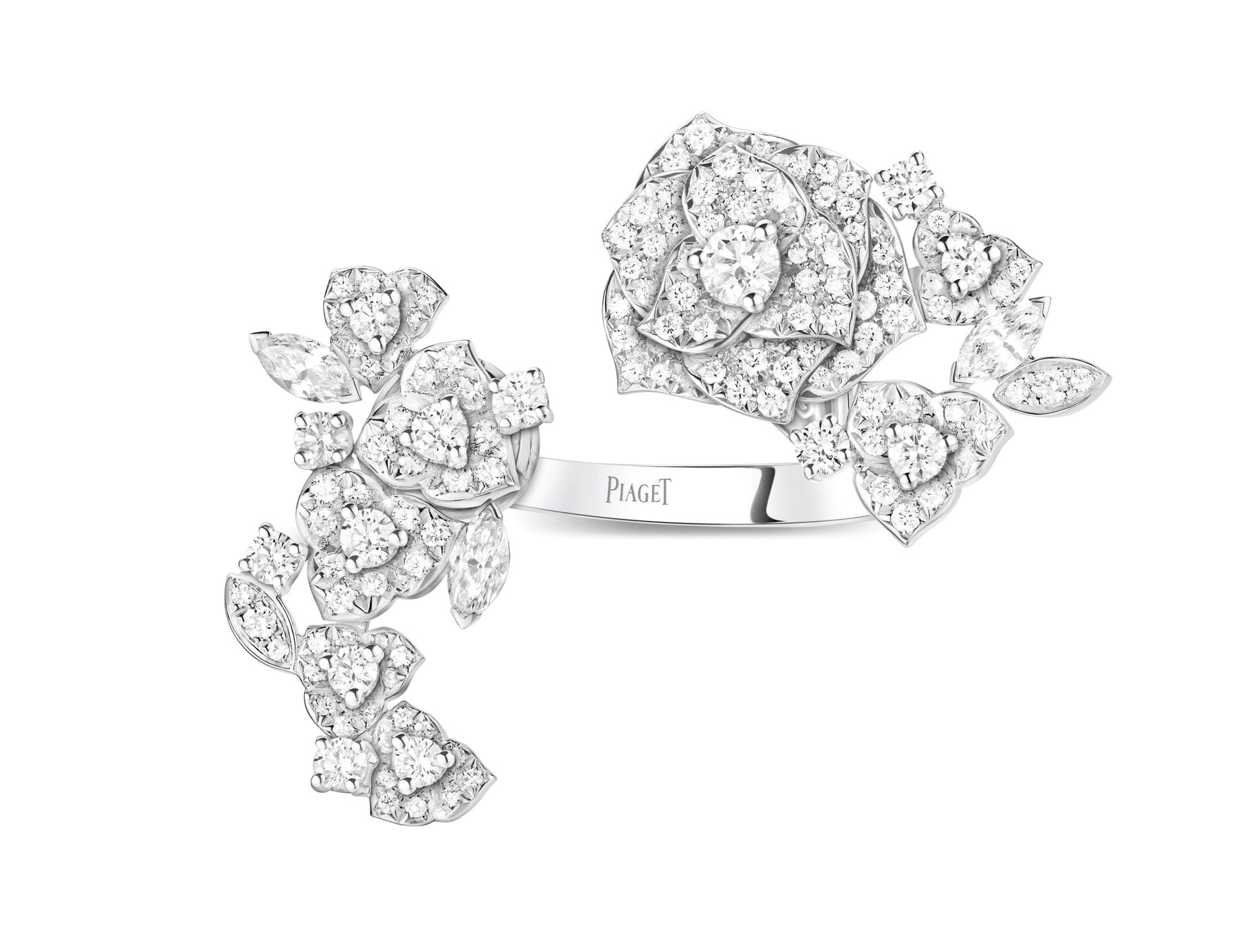 または、エメラルドとバラの両方をあしらった、美しい宝石の庭園として。見事なバラのブーケは耳元にも広がり、中央のエメラルドを取り囲むマーキスカットダイヤモンドの葉をあしらったシングルイヤリングが、遊び心のあるアシンメトリーなデザインとなっています。繊細に彫刻が施された花びらの直線的なシルエットが、何層にも重なったデザインとコントラストを成し、ダイヤモンドが露の雫のようにそっとあしらわれています。マーキスカットダイヤモンドが施された葉は、ピアジェの大胆な創造性の黄金時代であった1970年代を彷彿とさせます。新しいローズ・ジュエリーを特徴付けるアシンメトリーなデザインは、自然界に無限に広がる無作為の成長と、ピアジェの太陽の温かさに満ちたスピリットに育まれた、バラの若々しいエネルギー、生命、そして愛を象徴しています。