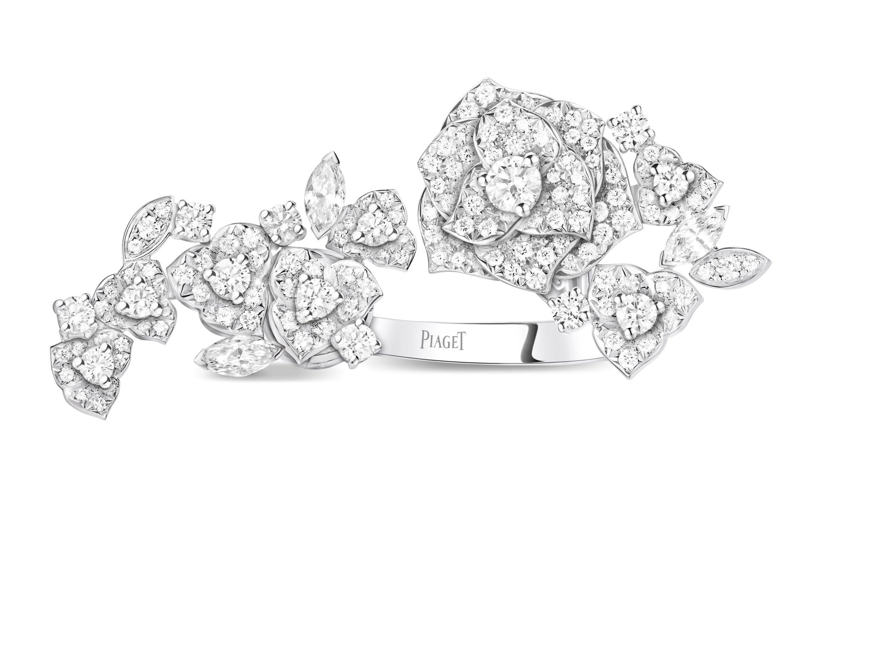 歴史において、花と宝石は常に密接に結びついてきました。最も古い装飾品のひとつである花は、いつの時代も、あらゆる世代の金細工職人やジュエラーを魅了し、挑戦し続ける対象となってきました。花の女王であり、女性らしさのエッセンスであり、ロマンスの象徴であるバラの神秘的な美しさは、ジュエラーにとって特別な魅力を持つものです。バラが持つ感情的な魅力、儚さを永遠のものに変えるという挑戦を促します。ピアジェは、バラの儚く壮麗な美しさを永遠に輝く宝石と貴金属で見事に表現し、ゴールドで軽やかでシルクのような柔らかさを、ダイヤモンドで露に濡れた詩的な美しさを映し出しています。