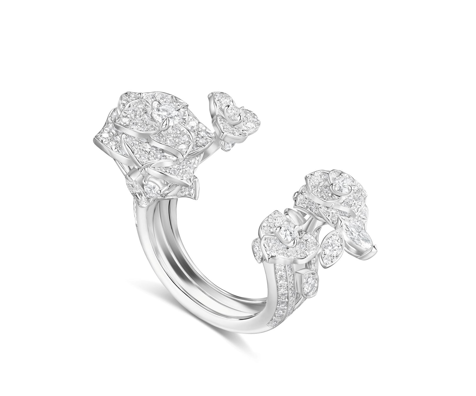 また、手触りの良いスライド式ペンダントに沿って、つぼみから豊かな花へと成長します。ハイジュエリーリングにもその多様性と独創性が反映されており、1つのリングで異なるスタイルやムードが楽しめる3つのオプションがあります。エメラルドのみをダイヤモンドの上に配置したクラシカルなシングルストーンリング。エメラルドを外し、花と革新的な構造に焦点を当てたバラモチーフのみの現代的な