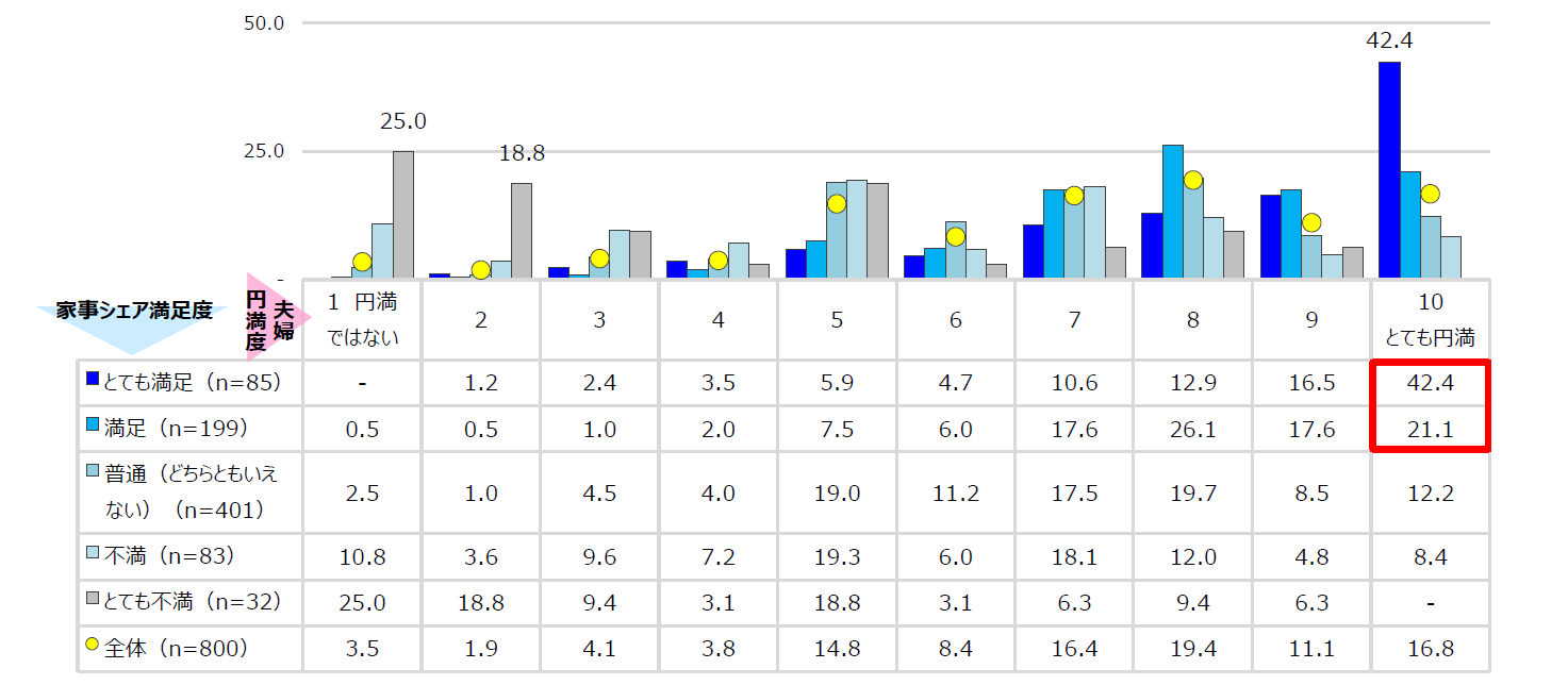 一方、家事シェアに「とても不満」とした人の25.0%が夫婦円満度について、最低評価の「1(円満ではない)」、18.8%が「2」と回答。「10」評価は0%でした。