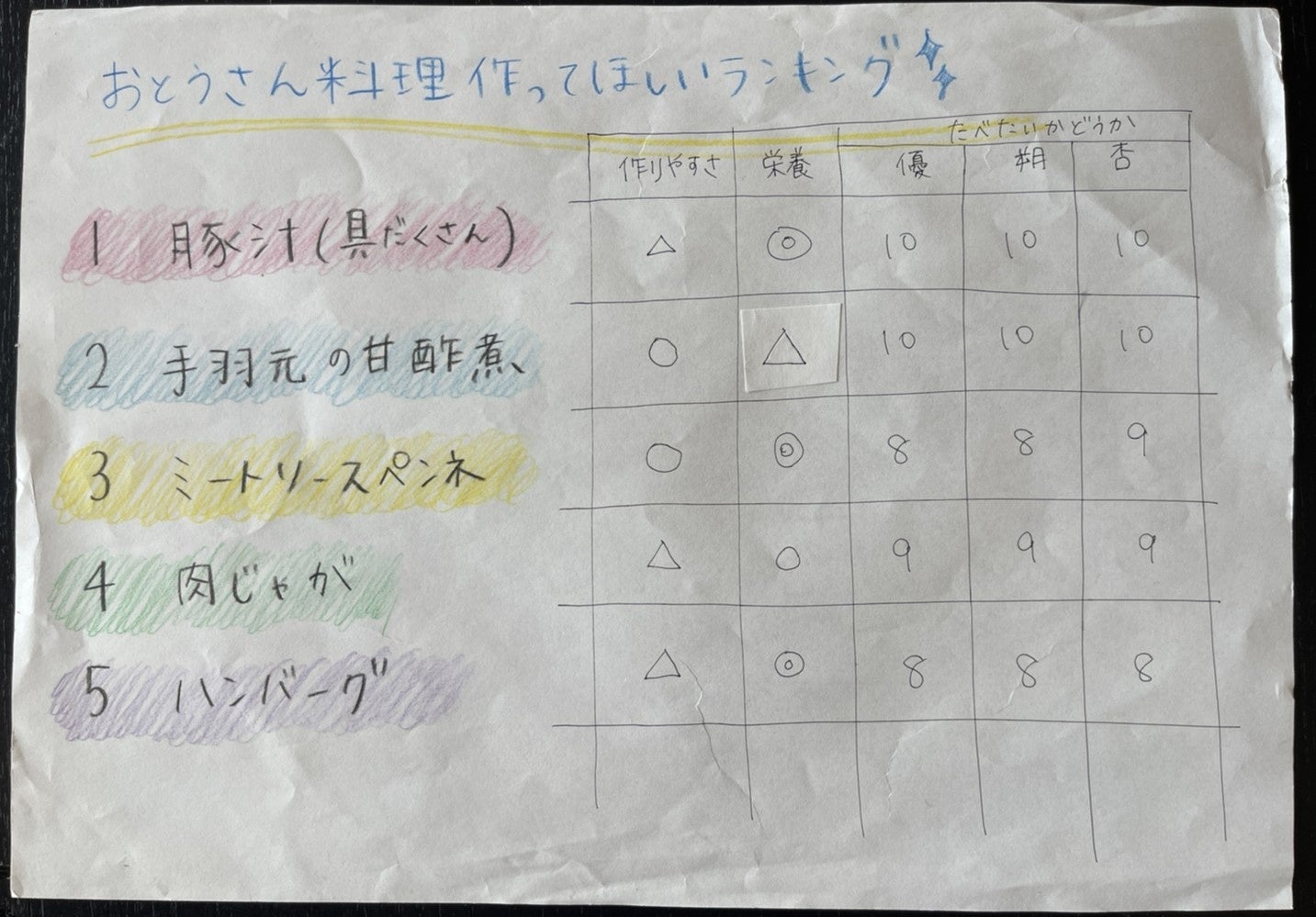 実際に香村さんのご家庭で作成した「お父さんに作ってほしい料理ランキング」