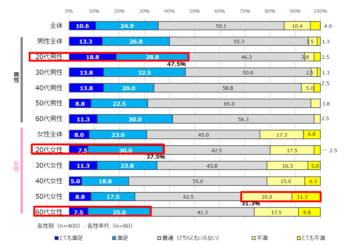 性年代別にみると、男女とも20代の満足度が最も高く、「20代男性」(47.5%)は約5割、「20代女性」(37.5%)は約4割が「満足」していることがわかりました。
