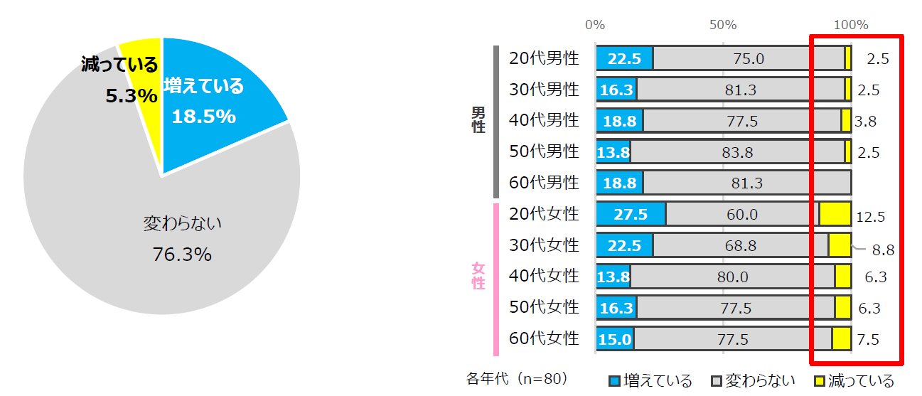 昨年と比較して「家事にかけられる時間」の変化を見ると、全体では「増えている」が18.5%で約2割、「減っている」は5.3%でした。