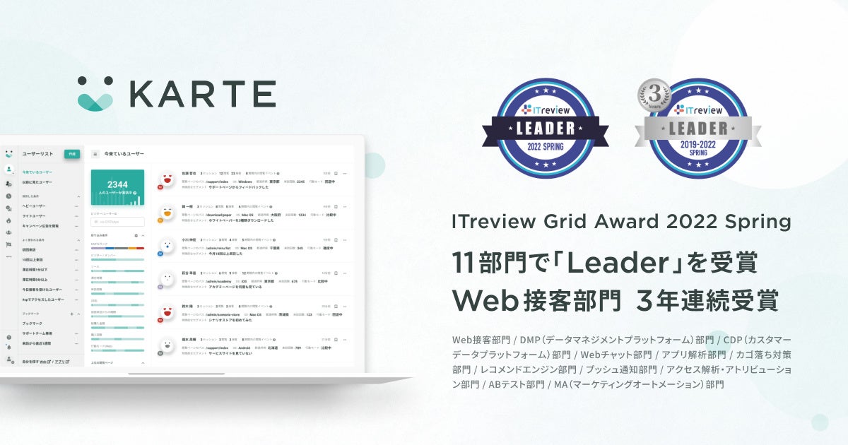株式会社プレイド(東京都中央区:代表取締役CEO 倉橋健太)の提供するCXプラットフォーム「KARTE」が、アイティクラウド株式会社(東京都港区:代表取締役社長 黒野源太)運営のIT製品レビュープラットフォーム「ITreview(アイティレビュー)」において満足度・認知度ともに優れた製品であると評価され、「ITreview Grid Award 2022 Spring」の11部門にて「Leader」を受賞しました。また、「Web接客」部門では3年連続で「Leader」を受賞しています。