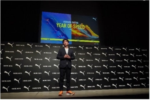 商品発表会の冒頭には、プーマ ジャパン代表取締役ジェネラルマネージャー井上緑斎が登壇。井上代表はプーマのブランドマントラでもある“Forever.Faster.”、そしてスピードに込めた想いとして「プーマは、まずサッカーおよびランニングの2つのカテゴリーにフォーカスし、新しい商品を通じて世界のアスリートをサポートしていきたい。」とコメントしました。