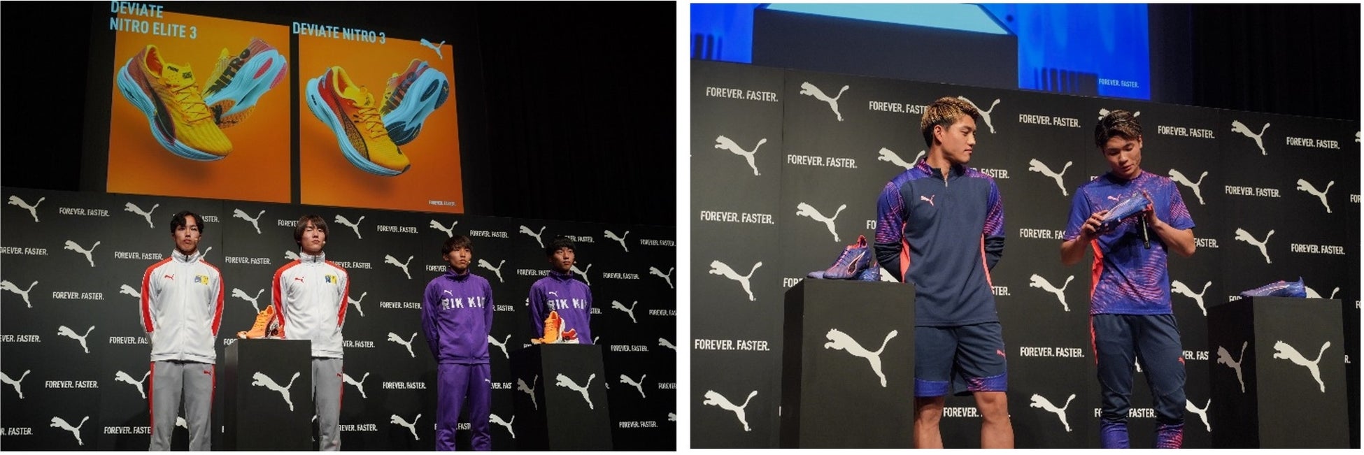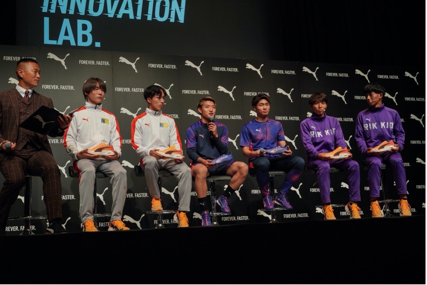 発表会はサッカー界から堂安律選手、福田師王選手、ランニング界から城西大学男子駅伝部の林晃耀選手、桜井優我選手、立教大学体育会陸上競技部男子駅伝チームの林虎大朗選手、稲塚大祐選手の計6名のゲストを招き、プーマのブランドマントラでもある“Forever.Faster.”に基づき、“スピード”の重要性について、サッカーとランニングといったスポーツの垣根を超えて話すトークセッションを実施しました。
