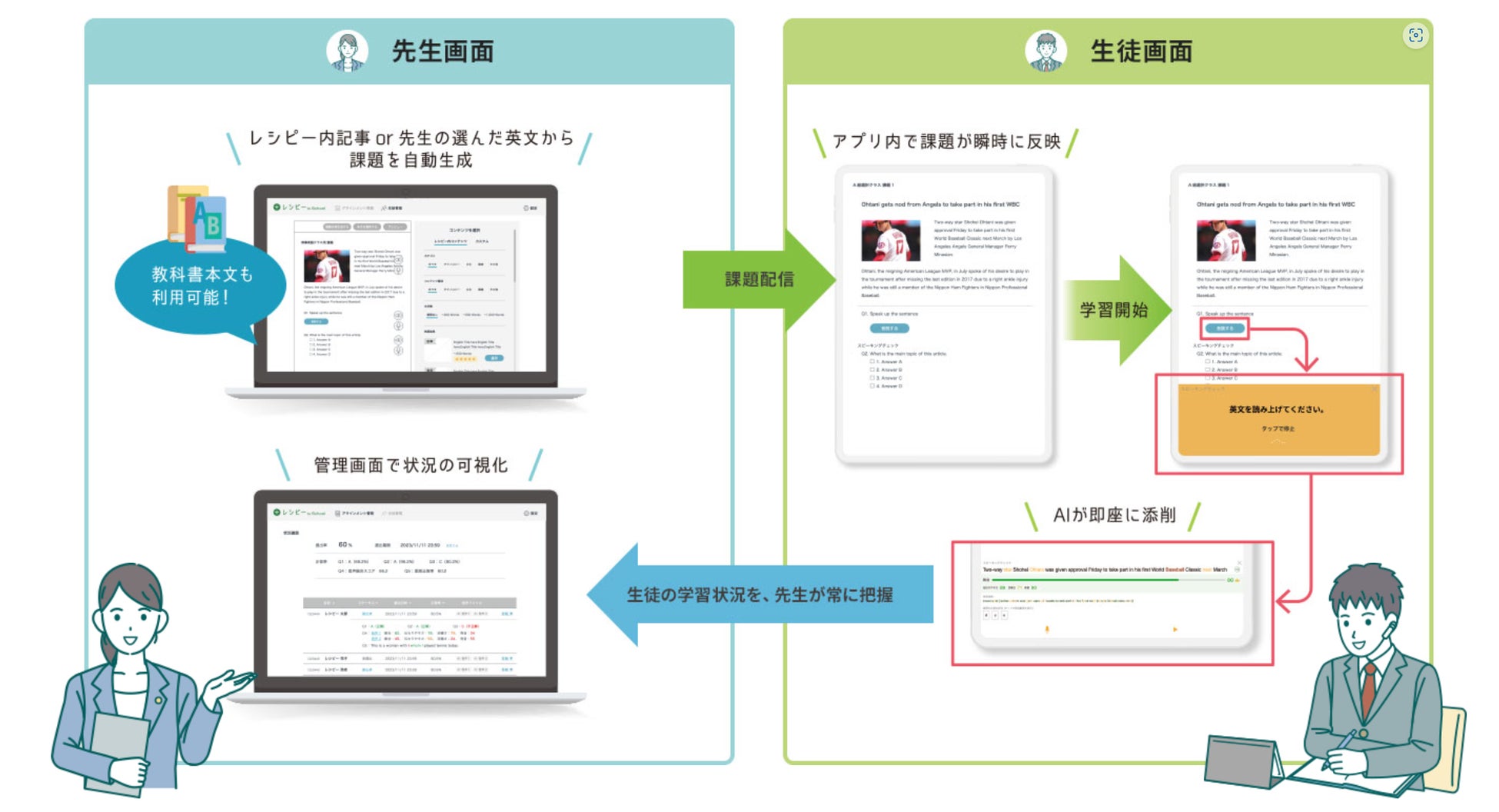レシピー for School では、多くの先生が課題感を抱いている『 授業の課題作成の工数を削減 』『 リアルな英語での授業 』をサポートすることが可能です。