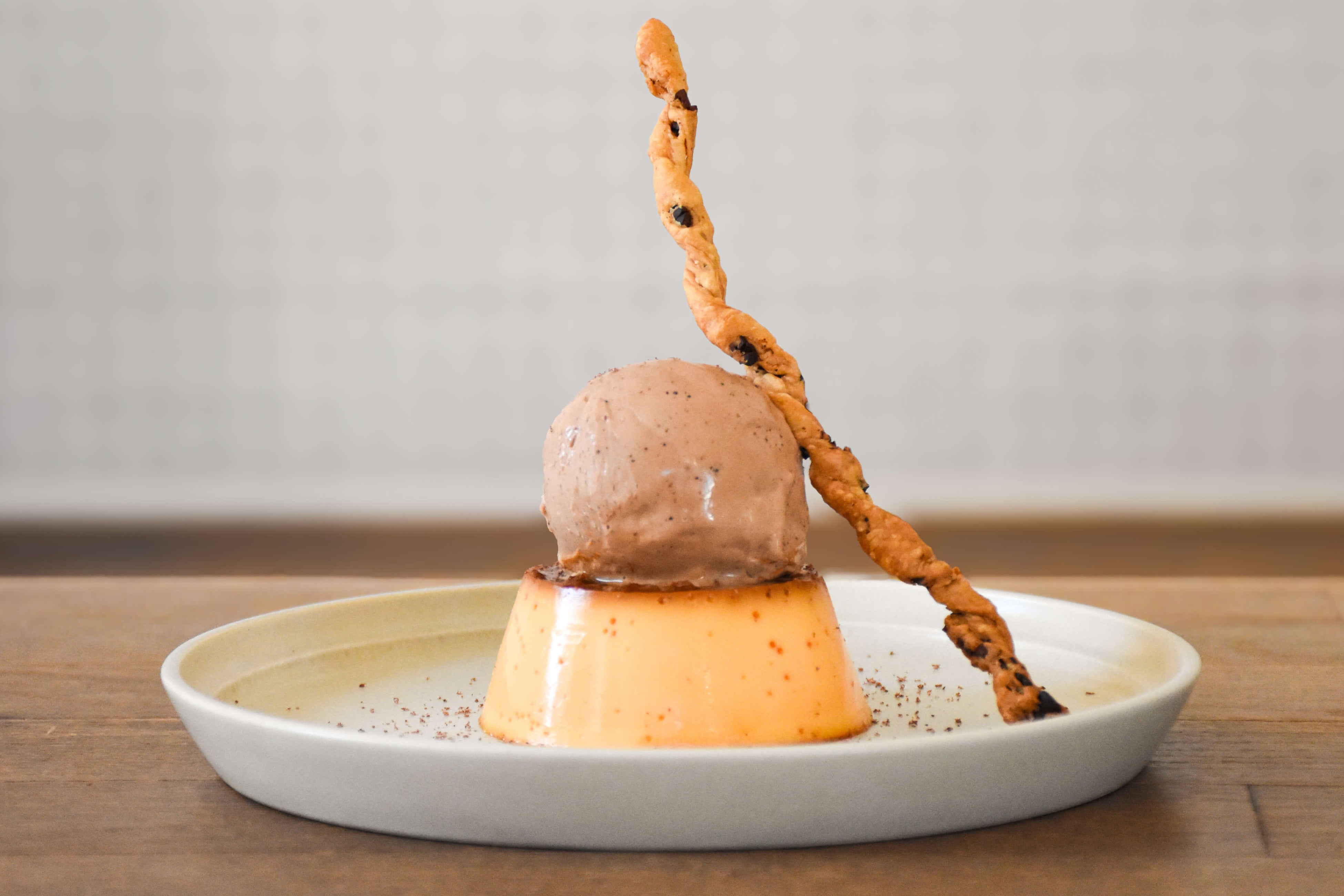 プリンの上にトッピングした自家製アイスは、カカオ由来のナッツ風味のチョコレートと、ガーナ産カカオ豆80%のチョコレート、さらにホワイトチョコレートをブレンドし、芳醇な香りと甘味をしっかり感じる味わいに仕上げました。