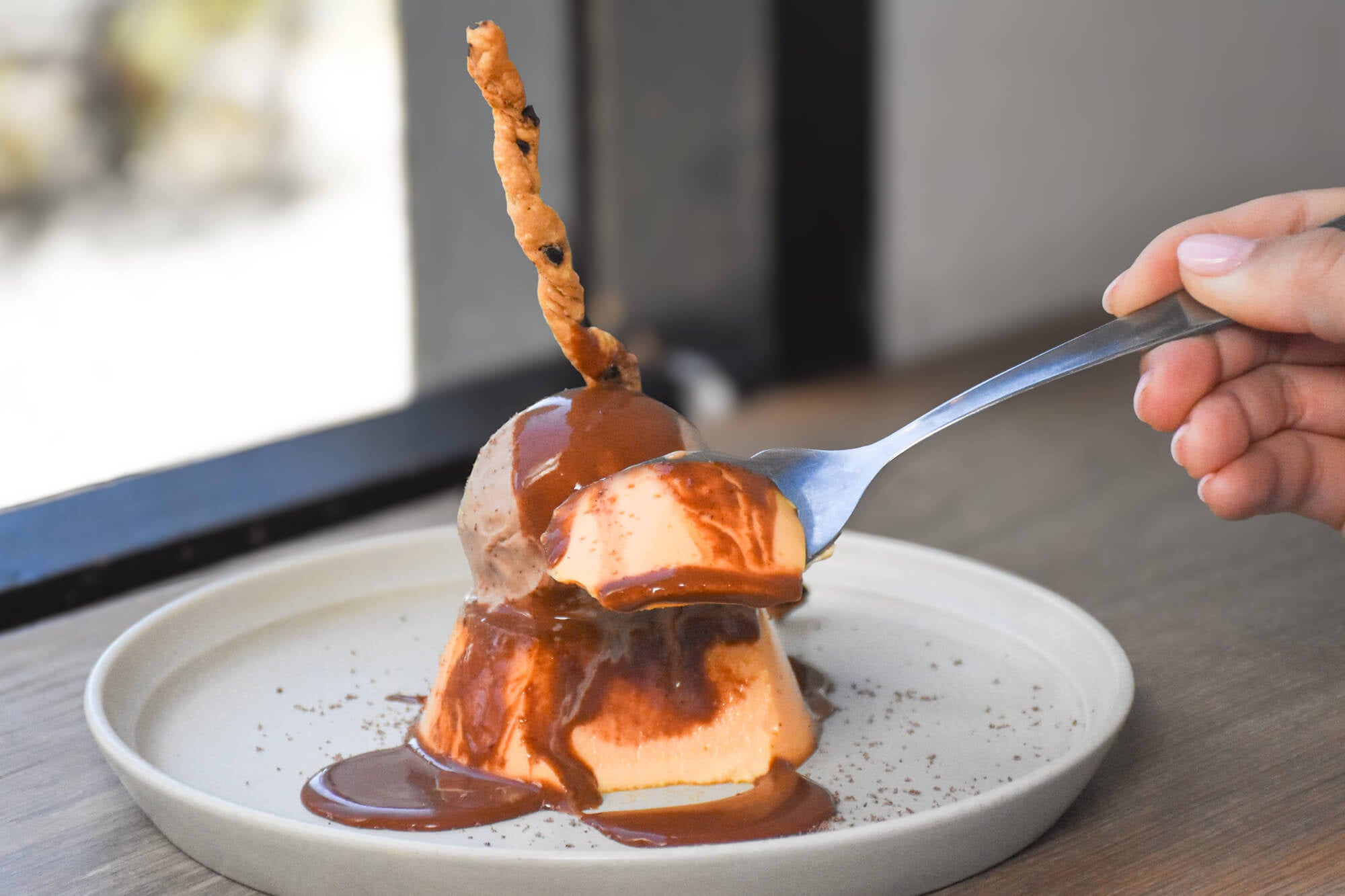 この春は、クラシカルなプリンと濃厚なチョコレートアイスに、カカオ由来の果実味を活かしたフルーティーなチョコレートソースを添えた、春らしいプリンをご用意しました。