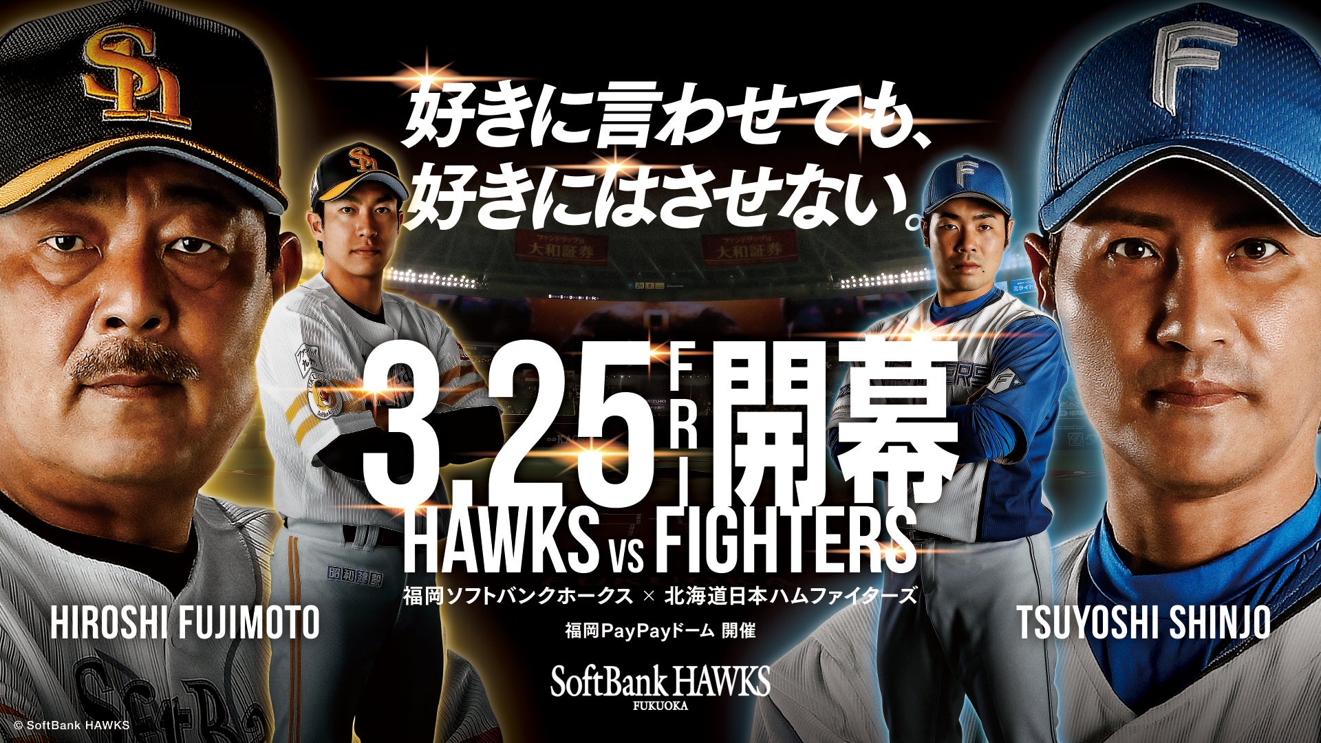 共に初陣となる福岡ソフトバンクホークス藤本博史監督と北海道日本ハムファイターズ新庄剛志監督が対峙したデザインのキービジュアルでは、新シーズンに向かう両監督の覚悟と闘志を表現し、日本中が注目する歴史的な一戦を盛り上げます。チケットは2月14日(月)よりホークス公式チケット購入サイト「タカチケット」にて先行抽選販売いたします。