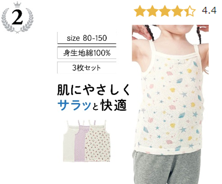 1位と同シリーズのキャミタイプ。肩ひもがずれにくい仕様、前後がわかりやすいリボン使いもポイント。