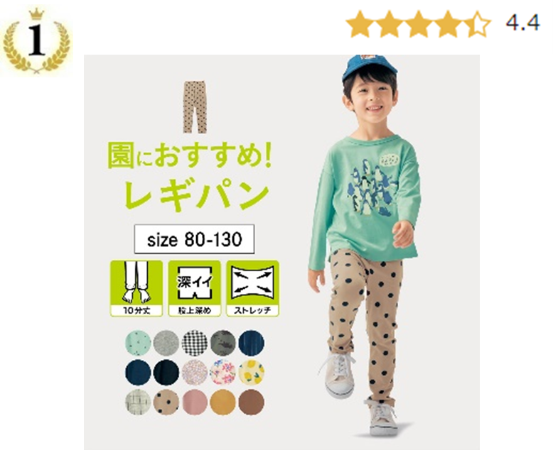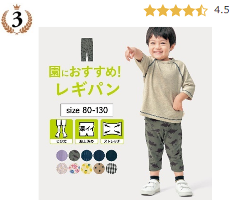 1位と同シリーズの七分丈。夏用の園パンツは、虫刺されやケガから守られるので、七分丈が大活躍します!