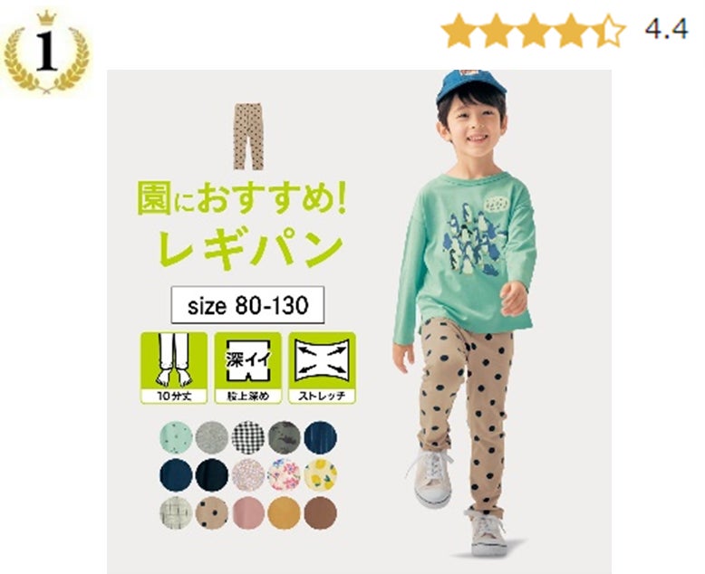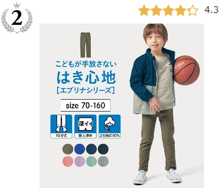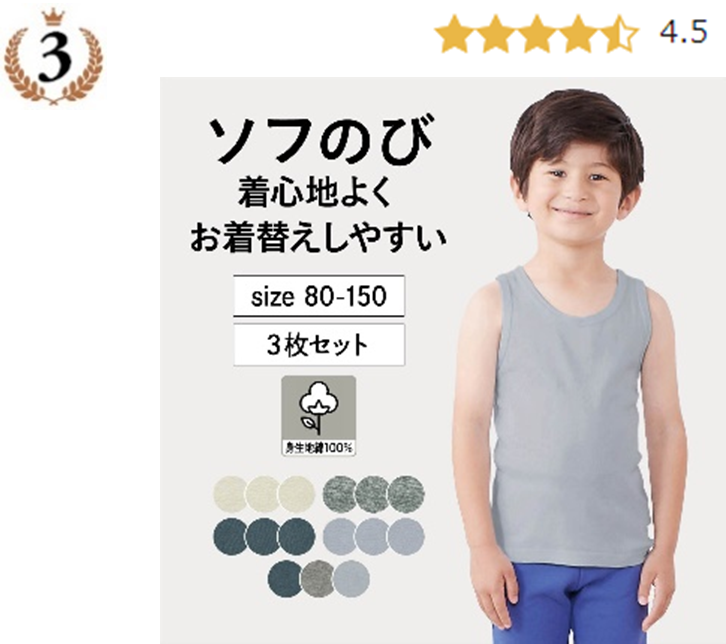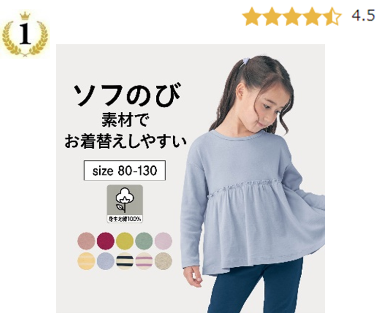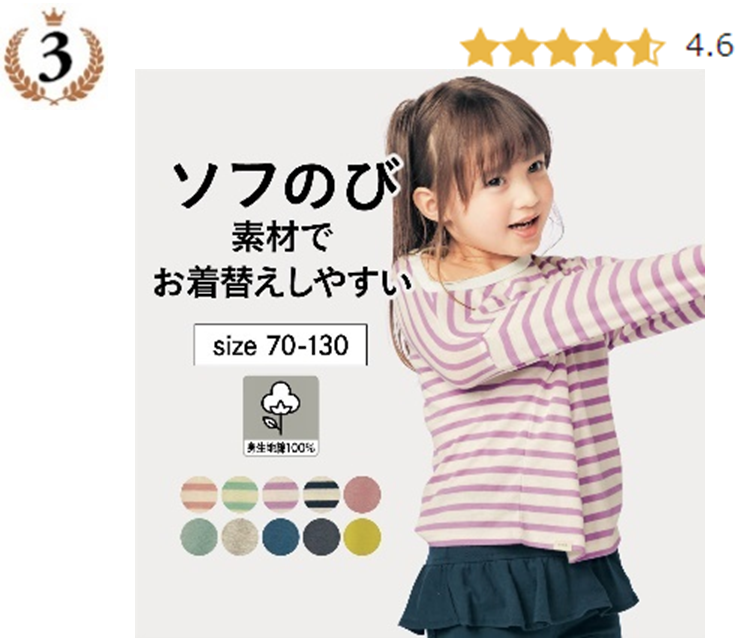 1位と同じソフのびシリーズ。綿100%素材なのに、よく伸びるので、一人でお着替えしやすい!