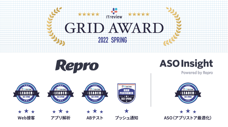 また、四半期に一度ユーザに支持された製品が表彰される「ITreview Grid Award」の2022 SPRINGではCEプラットフォーム「Repro」が『Web接客』『アプリ解析』『ABテスト』3部門で最高位「Leader」を4期連続受賞、ASO(アプリストア最適化)支援ツール「ASO Insight」が、『ASO(アプリストア最適化)』の部門で「Leader」を2期連続受賞したことをお知らせいたします。