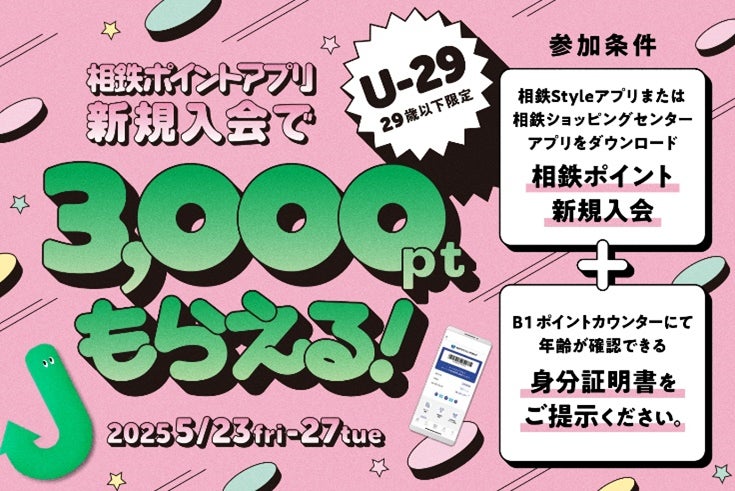 また同時期には、相鉄ポイントに新規入会の29歳以下の方に限り、ポイントプレゼントキャンペーンを開催。相鉄Styleアプリまたは相鉄ショッピングセンターアプリをダウンロードし、相鉄ポイントに新規でご入会いただくと、相鉄ポイント3,000ポイントをもれなくプレゼントいたします。さらに、ジョイナス館内で3,000円(税込)以上ご利用いただいた方には、抽選で20名様に10,000ポイントをプレゼントいたします。