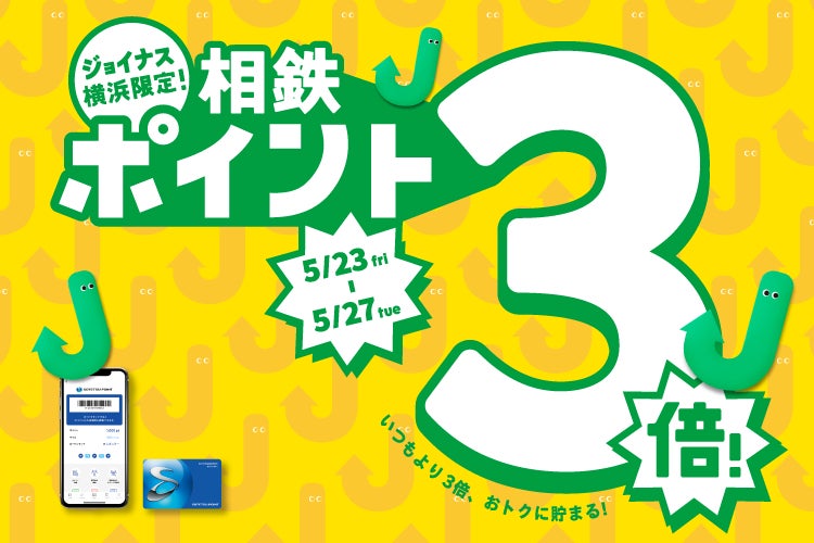 相鉄グループの㈱相鉄ビルマネジメント(本社・横浜市西区、社長・左藤 誠)が運営するジョイナスは、2025年5月23日(金)~27日(火)の5日間、いつものお買い物・お食事で通常と比較して3倍のポイントがたまるキャンペーンを開催いたします。また、29歳以下限定で相鉄ポイント会員へ新規入会すると3,000ポイントをプレゼントする、新規入会キャンペーンも同時に開催いたします。 ぜひこの機会に、おトクにジョイナスでのお買い物をお楽しみください。