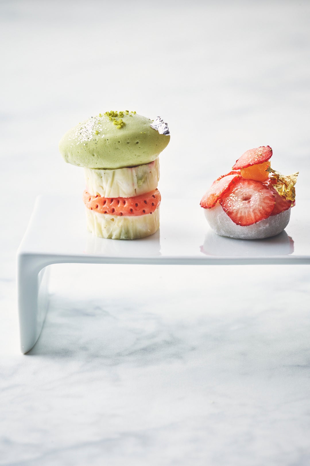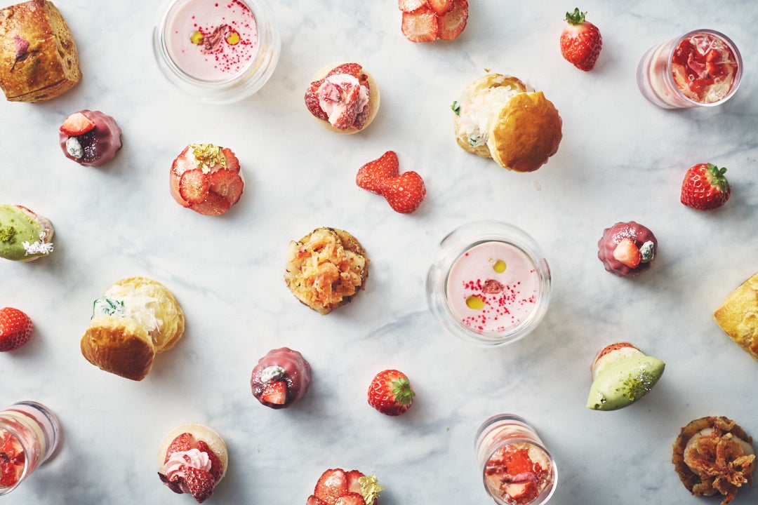 すっきりとした甘さのお米のババロアに日本酒のゼリーや桜を合わせた大人な味わいのパフェ、求肥に包まれた粒あんにスライスいちごをトッピングしたいちご大福、桜リキュールとコンソメゼリーの桜ヴィシソワーズなど、スイーツもセイボリーも春爛漫!淡く儚い桜ピンク、エモーショナルないちごの紅色、春に一斉に芽吹く草木のようなやわらかなグリーンと、見た目にも春の息吹を感じるココロ浮き立つアフタヌーンティーです。