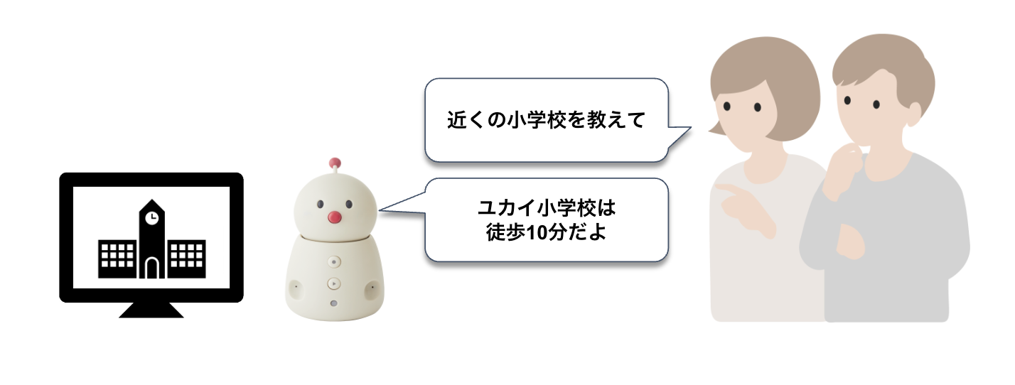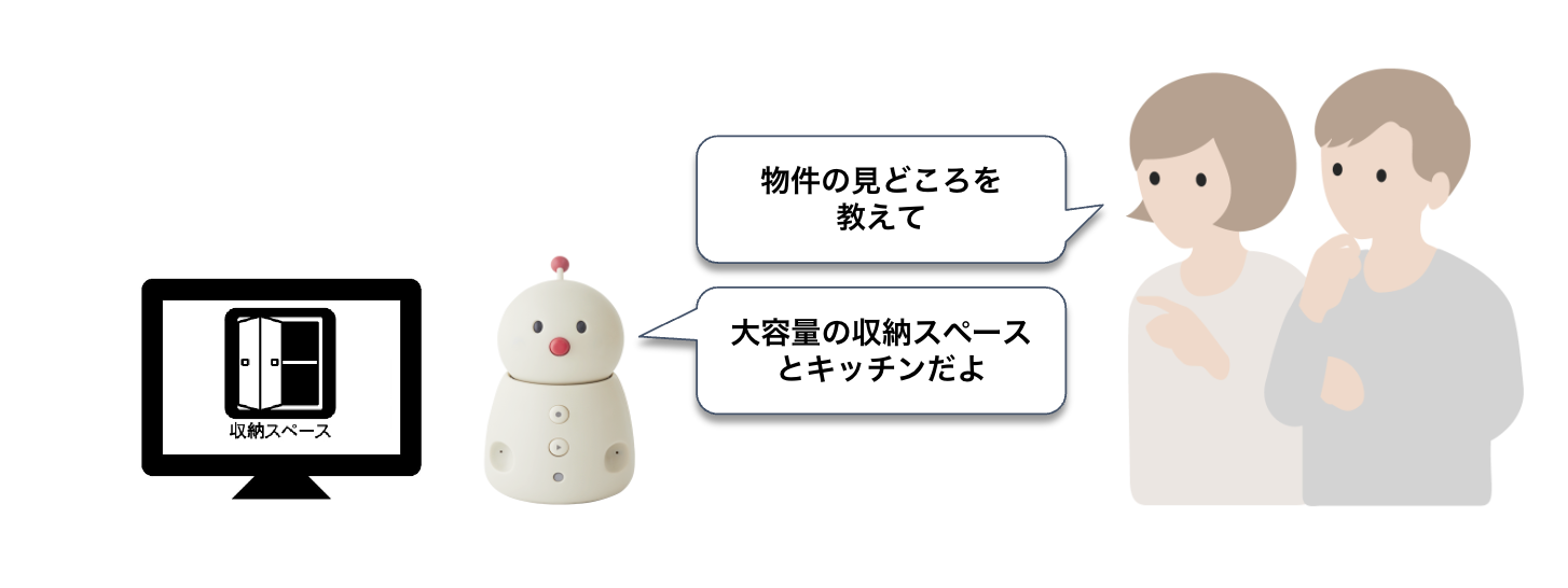 「BOCCO emo」の発話内容や発話タイミングに合わせてデジタルサイネージに画像や動画が表示されるため、従来の音声に加えて視覚的な情報を提供できるようになります。対話や表示の内容を容易に設定変更できるシステムであるため、不動産物件来場者に対する無人案内だけでなく、営業業務の支援、マンション管理支援、共用部予約、ショールーム受付等、幅広いユースケースに活用いただけます。