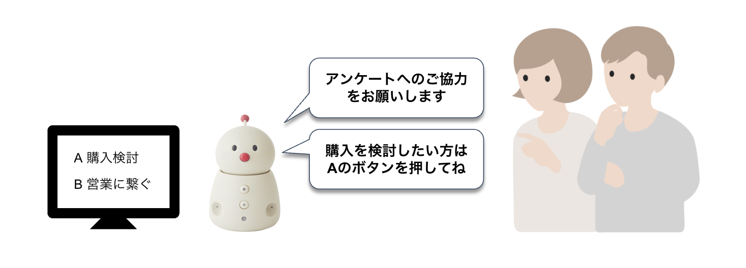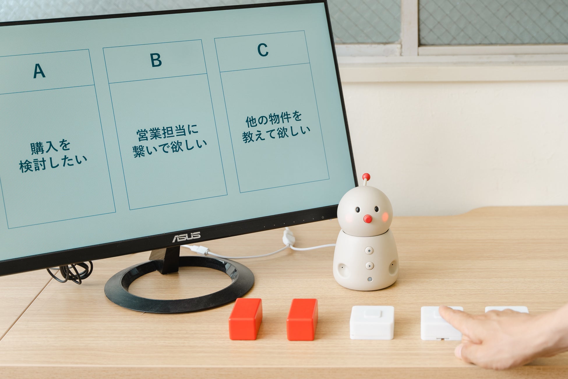 販売中の不動産物件の内見来場者を「BOCCO emo」が出迎え、物件のお薦めポイントをご紹介する他、対話によるお問い合わせ対応や外付けボタンによるアンケート取得まで対応します。
