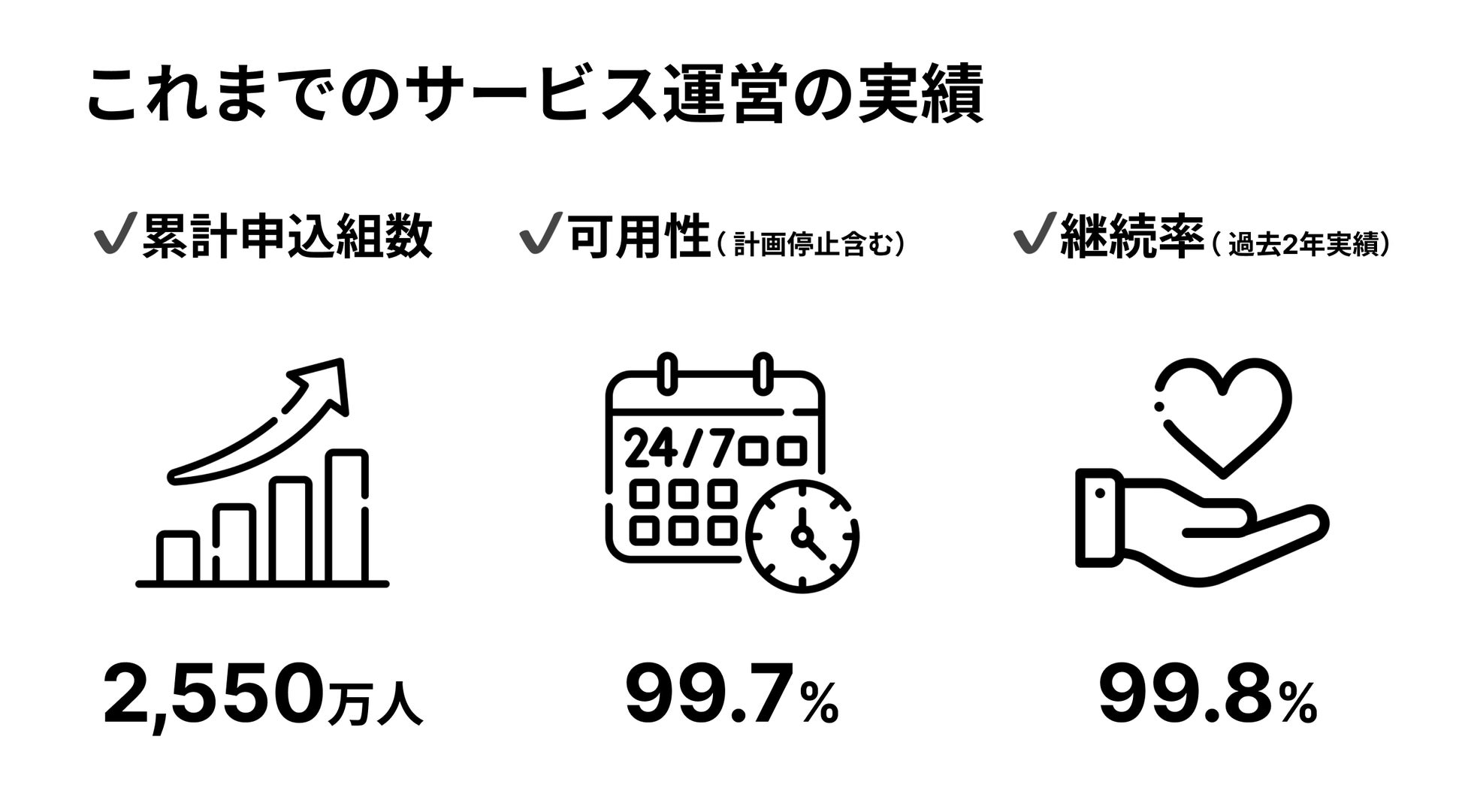 サービスを開始して以降、累計利用者数は1,000万組・約2,550万人 にのぼり、直近24ヶ月平均継続率は99.8% 、システム可用性99.7% (計画停止含む)を実現し、この度の累計導入施設数4,000施設 にいたりました。