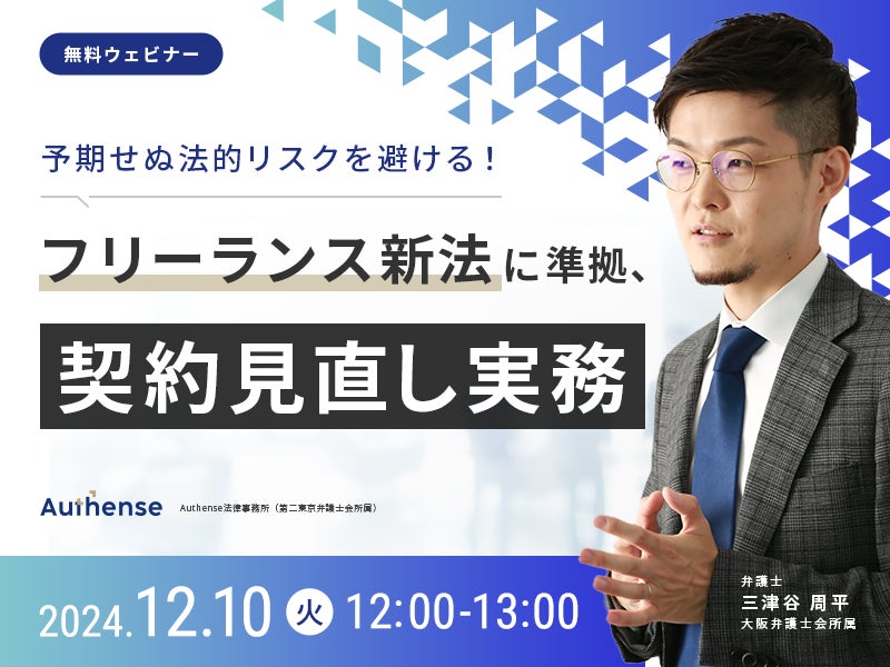 Authense法律事務所(東京都 港区)は、12月10日(火)に「予期せぬ法的リスクを避ける!フリーランス新法に準拠、契約見直し実務」と題したウェビナーを開催いたします。本ウェビナーでは、前回ご好評をいただいたフリーランス新法関連のセミナーの第二弾として、当事務所の三津谷 周平弁護士が、フリーランス新法のポイントを実務に基づいて解説します。