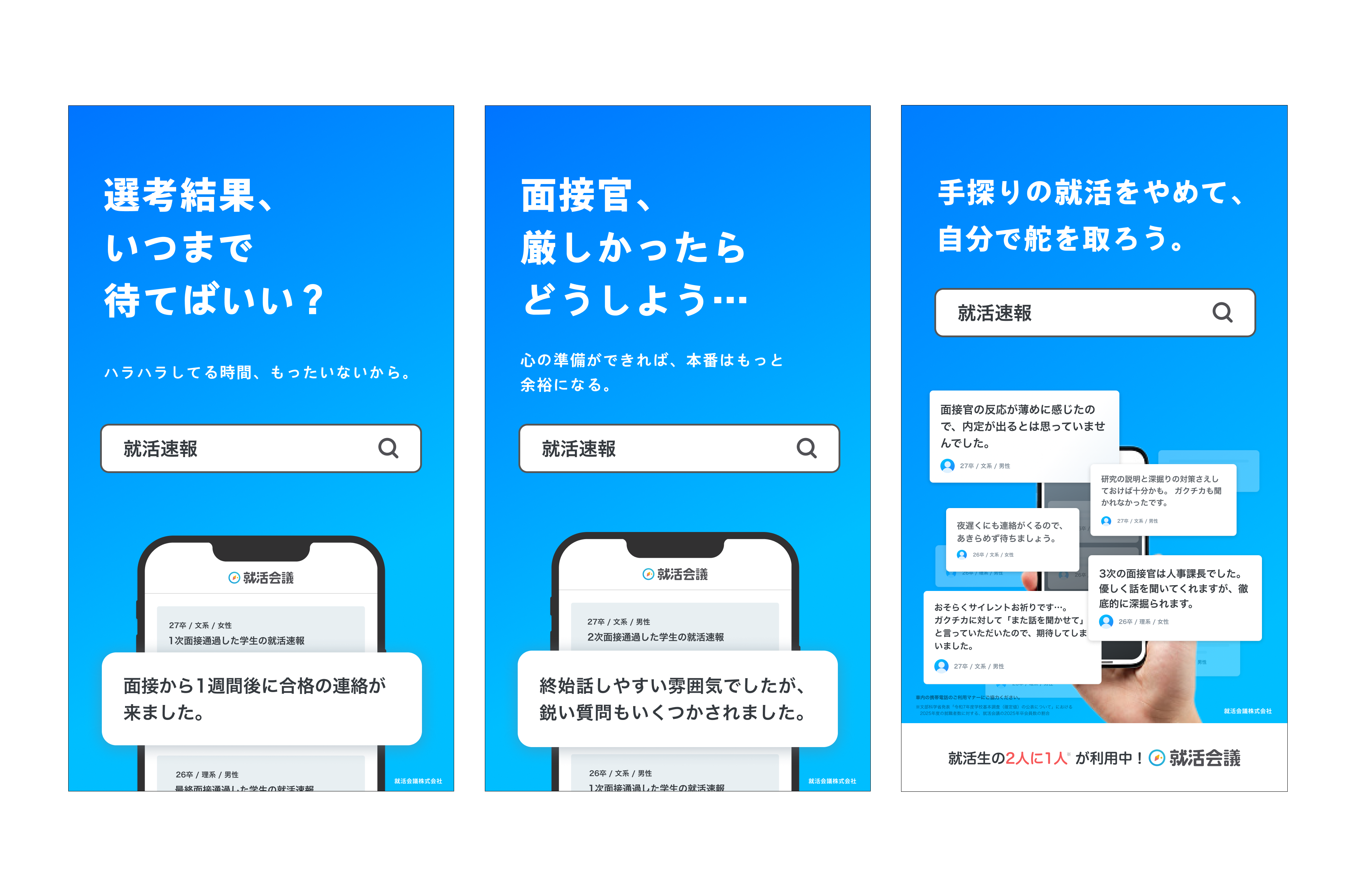 「選考結果がわかるまで心が落ち着かない」「選考本番まで何が起きるかわからない」といった就活生が抱きがちな不安を和らげ、誰もが万全の状態で自分らしく選考に臨めるという就活速報の強みを、実際の操作画面や利用シーンが直感的に伝わるデザインで表現しました。