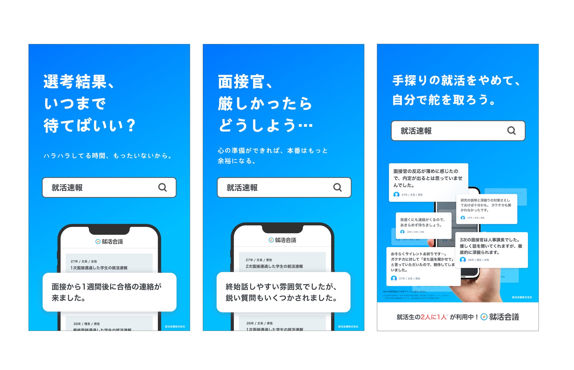 今回の広告では、選考が本格化する3月のトレンドに合わせ、すでに選考を受けた学生による投稿から企業ごとの選考状況をリアルタイムに把握できるコンテンツ「就活速報」にフォーカスしました。