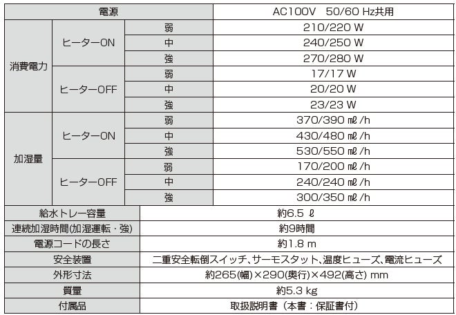 ・大容量6.5Lタンク。加湿量約550ml、約9時間の長時間連続運転が可能。
