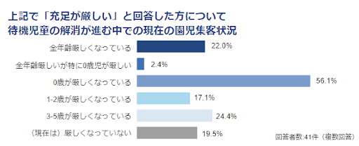 保育施設の増設により、待機児童が全国で減少する中、各地で「定員割れ」が目立ちはじめました。今回の調査では、保育施設を運営する法人の8割が今後の園児集客に課題を感じており、その中でも特に「0歳児の集客が厳しい」との回答が半数以上にのぼりました。"選ばれる保育園”になるためには、園児集客について何らかの対策を講じる必要性があり、その重要となるポイントについては「保育士の質」であるという声が最も多く、今後も保育士の質を向上するための取り組みや情報発信の強化が求められる結果となりました。