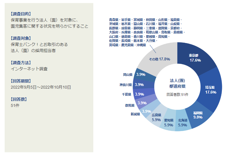 保育業界に特化した調査・研究を行う機関「保育士バンク!総研」を運営する株式会社ネクストビート(本社:東京都渋谷区、代表取締役:三原誠司)は、保育施設を運営する法人(園)を対象に、園児集客に関するアンケート調査を実施いたしました。この度、調査結果をまとめましたので概要をお知らせします。