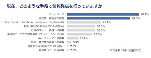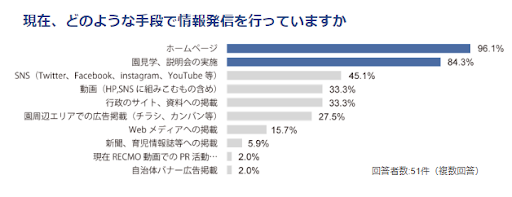 | 1. 園児の集客状況について └ 80.4%の法人が今後の園児集客に課題を感じており、現在の園児集客状況では「特に0歳児が厳しい」との回答が56.1%となった。 2. 園児集客のための取り組みについて └ 園児集客について重要となるポイントは「保育士の質向上」という声が最も多く64.7%となったが、実際に園児集客のための取り組みを実施している法人は43.1%となった。 一方で、取り組みを実施している法人では、既に「保育士の質向上」に関する取り組みを行っているという回答が最も多かった。 3. 園児集客のための情報発信について └ ホームページでの情報発信が96%と最多。一方で、今後強化すべきはSNSとの回答がホームページを上回る結果に。 |