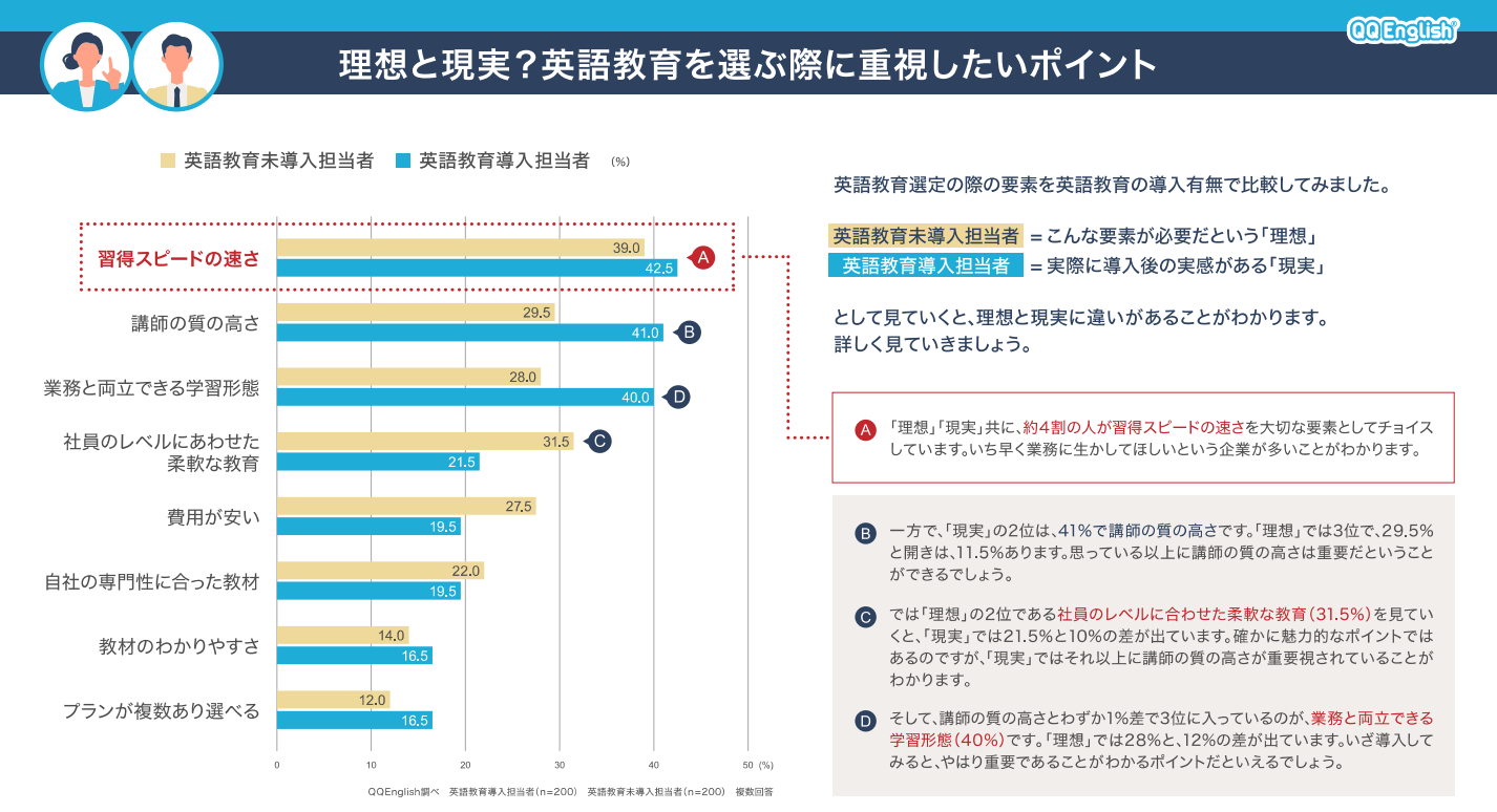 さらに、英語教育導入担当者(対象400名)が英語教育を選ぶ際に重視したいポイントは「習得スピードの速さ」が42.5%、講師の質の高さが41.0%と、多くの企業で習得スピードと質の高さを求める傾向にあることが分かりました。