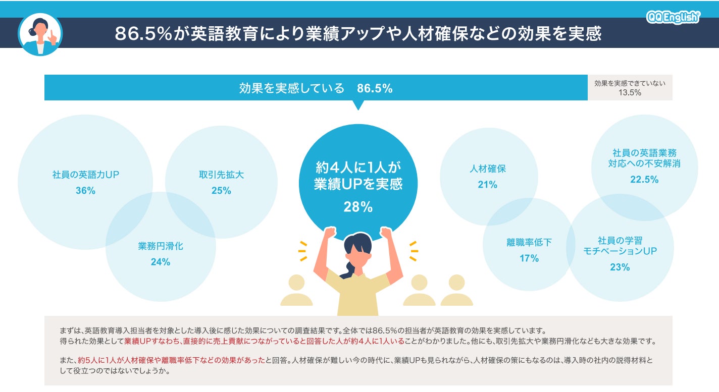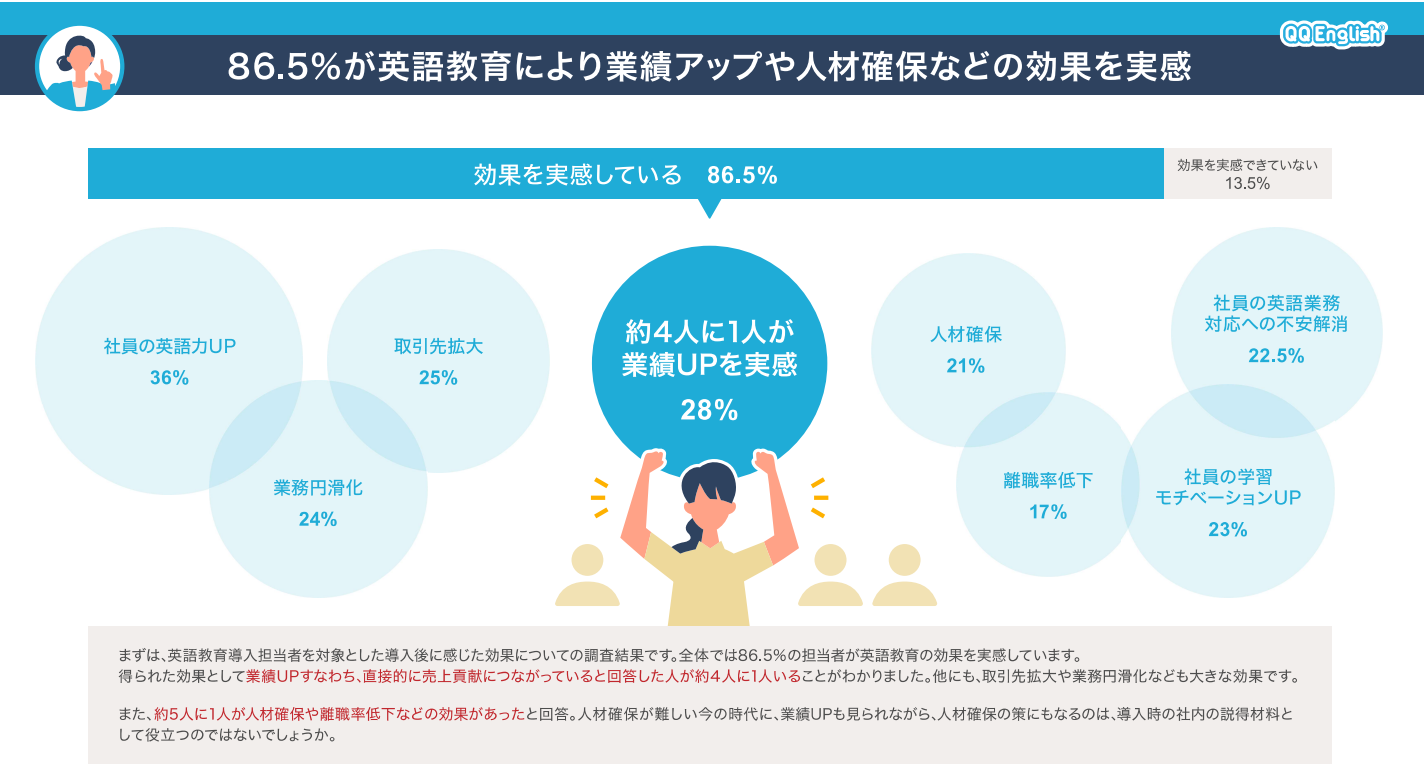 実際に英語教育を導入している企業に伺ったところ、86.5%が英語教育により業績アップや人材確保などの効果を実感しているようです。